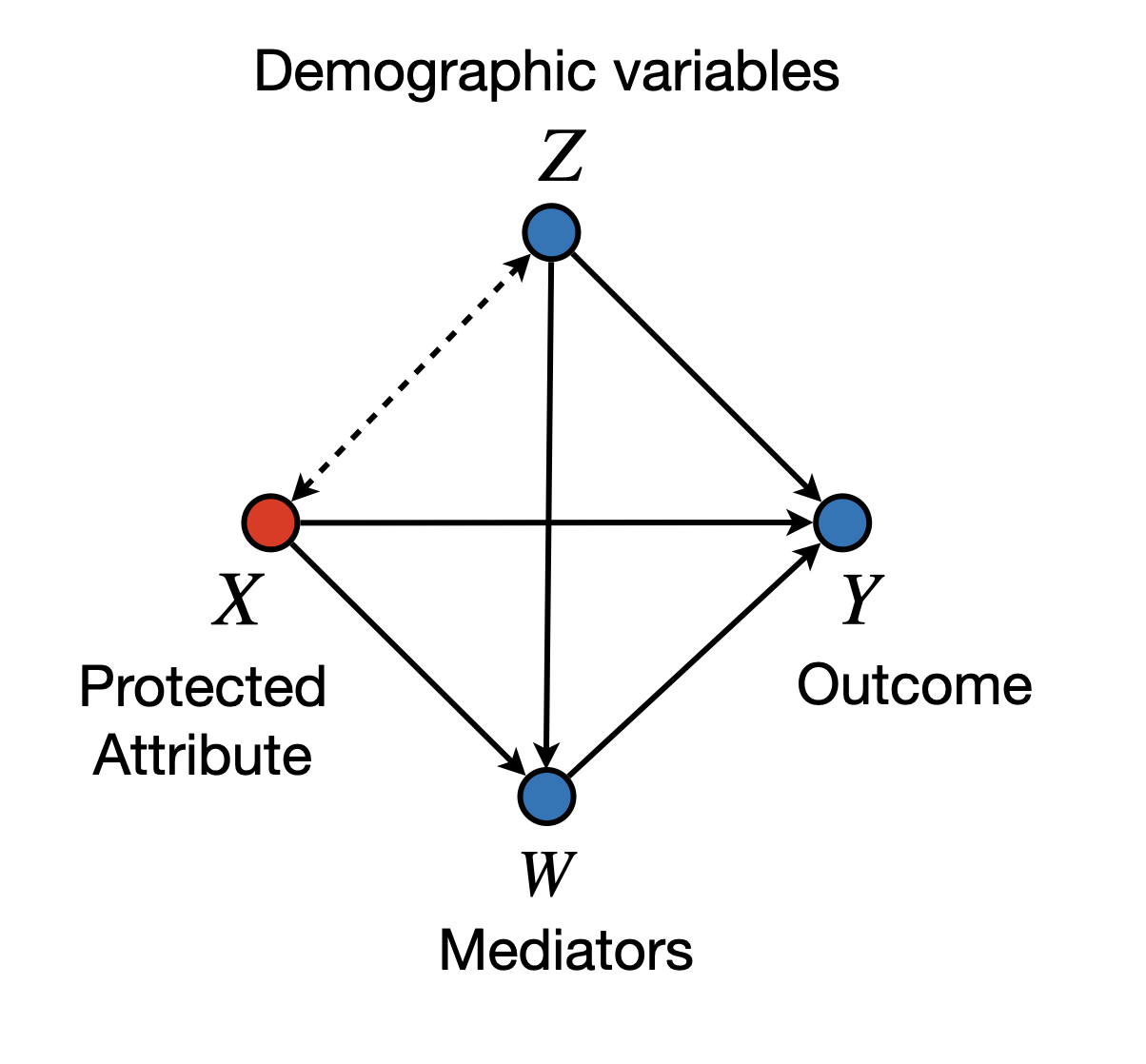 We in particular focus on the bidirected arrow between nodes \(X\) and \(Z\). Such an arrow in particular allows for the possibility that there are variations between \(X\) and \(Z\) that can be left unexplained in the model, or that unmeasured confounders may exist, or that we are dealing with selection bias. Practically speaking, assuming that no bidirected arrows exist is a strong assumption that does not hold in many settings. For instance, consider the widely recognized phenomenon in the fairness literature known as redlining(Zenou and Boccard 2000; Hernandez 2009). In some practical settings, the location where loan applicants live may correlate with their race. Applications might be rejected based on the zip code, disproportionately affecting certain minority groups in the real world.