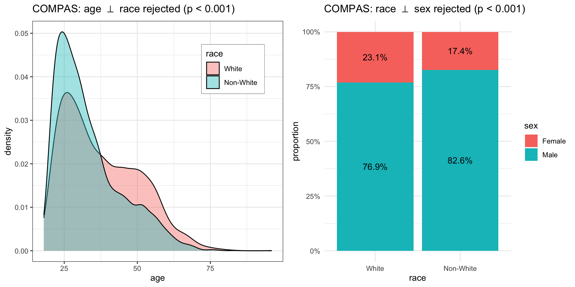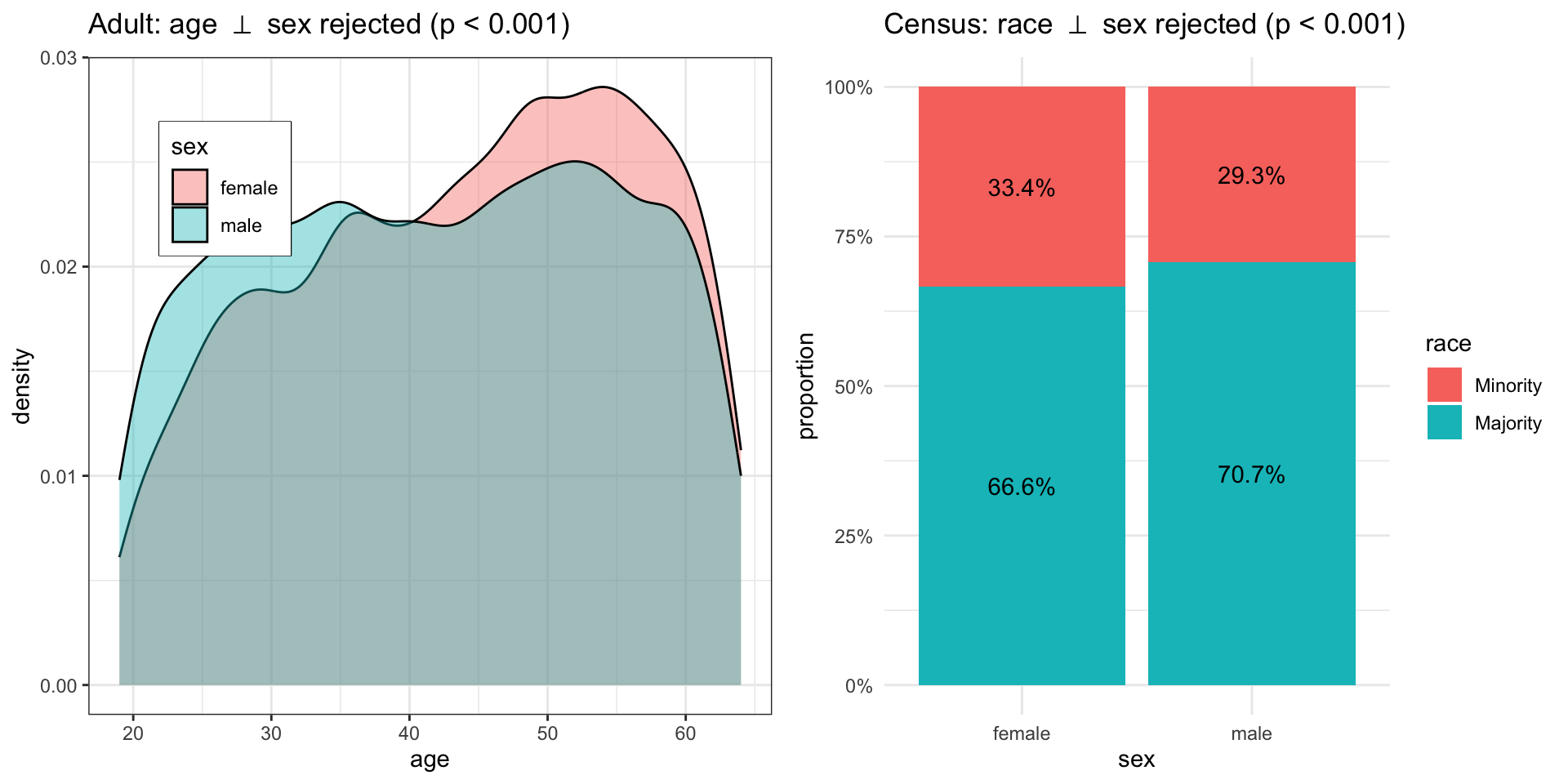 a1 <-ggplot(data, aes(x = age, fill = sex)) +geom_density(alpha =0.4) +theme_bw() +theme(legend.position =c(0.2, 0.8),legend.box.background =element_rect() ) +ggtitle(TeX("Adult: age $\\perp$ sex rejected (p < 0.001)"))a2 <-ggplot(data, aes(x = sex, fill = race)) +geom_bar(position ="fill") +geom_text(aes(label =percent(round(after_stat(count)/tapply(after_stat(count), after_stat(x), sum)[after_stat(x)], 4))),stat ="count", position =position_fill(0.5)) +scale_y_continuous(labels = percent) +ylab("proportion") +theme_minimal() +ggtitle(TeX("Census: race $\\perp$ sex rejected (p < 0.001)"))cowplot::plot_grid(a1, a2, ncol = 2L)