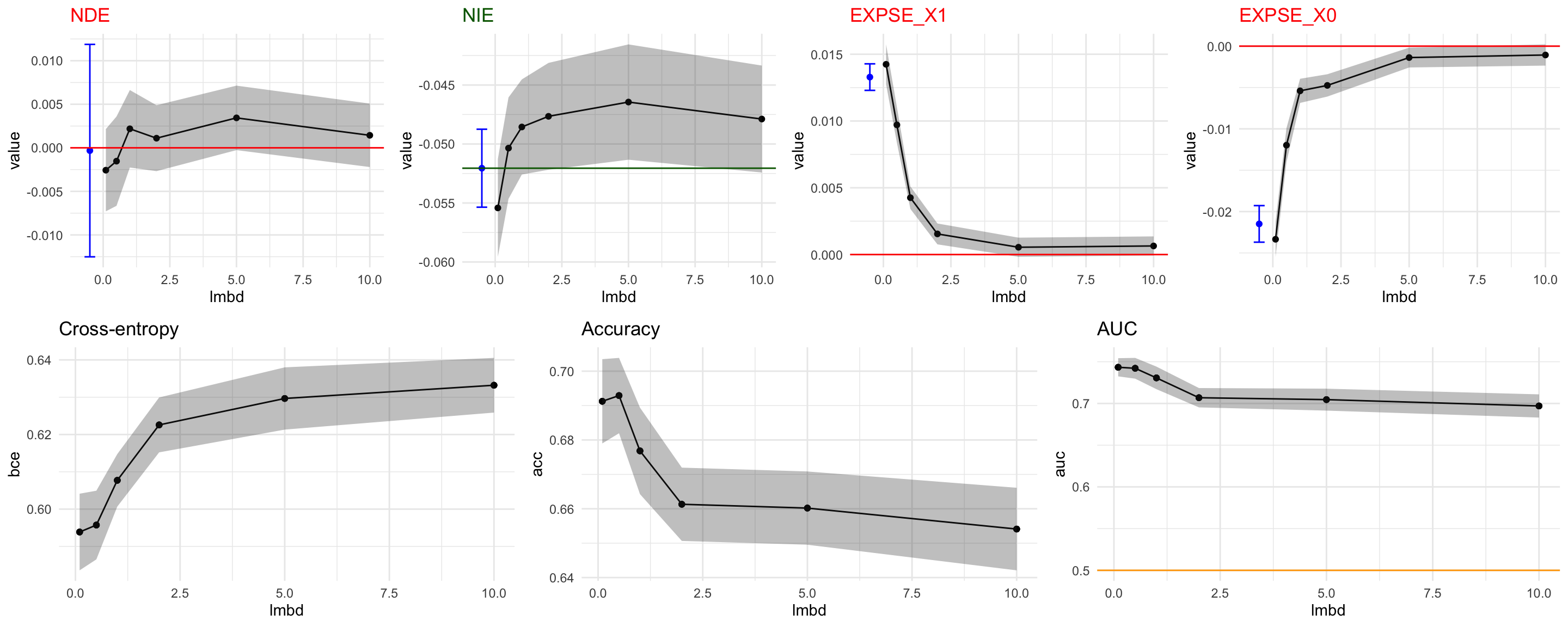 \] where the values \(\eta_1, \eta_2, \eta_3, \eta_4\) are either 0 if effect is not in the business necessity set, or equal the effect estimate for the true outcome \(Y\) (if the effect is BN). Multiple values of the tuning parameter \(\lambda\) are used at the same time (this choice can also be adjusted using the lmbd_seq parameter, to which an arbitrary sequence of values can be passed). For binary classification the loss \(L(y, \hat{y})\) is the cross-entropy, whereas for regression the loss is the mean squared error (MSE).