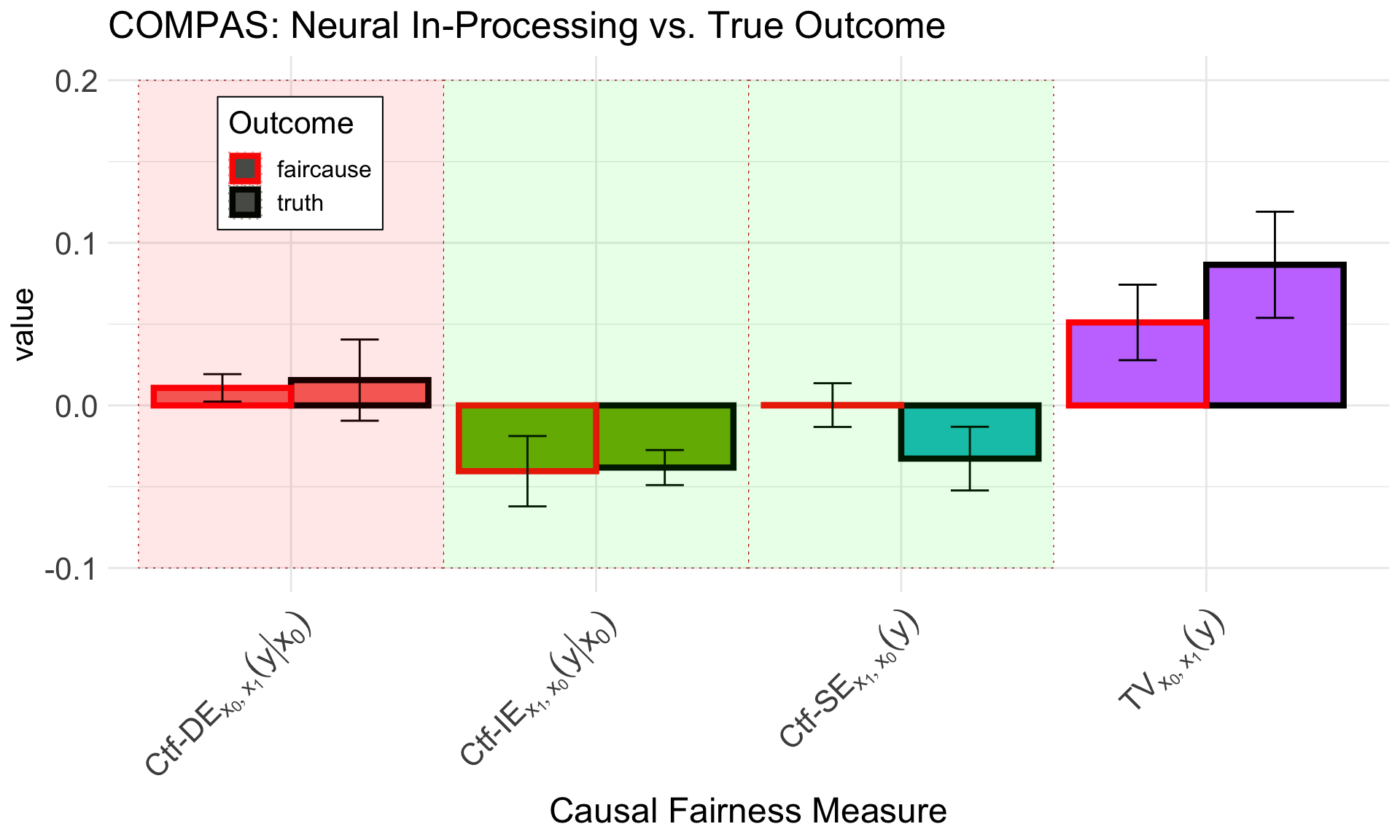 # decompose the predictions on the eval settrain_idx <-seq_len(round(0.75*nrow(data)))faircause_decomp <-fairness_cookbook(data[-train_idx,], X = X, W = W, Z = Z,Y ="faircause_preds",x0 =0, x1 =1, nboot1 =20, nboot2=100)