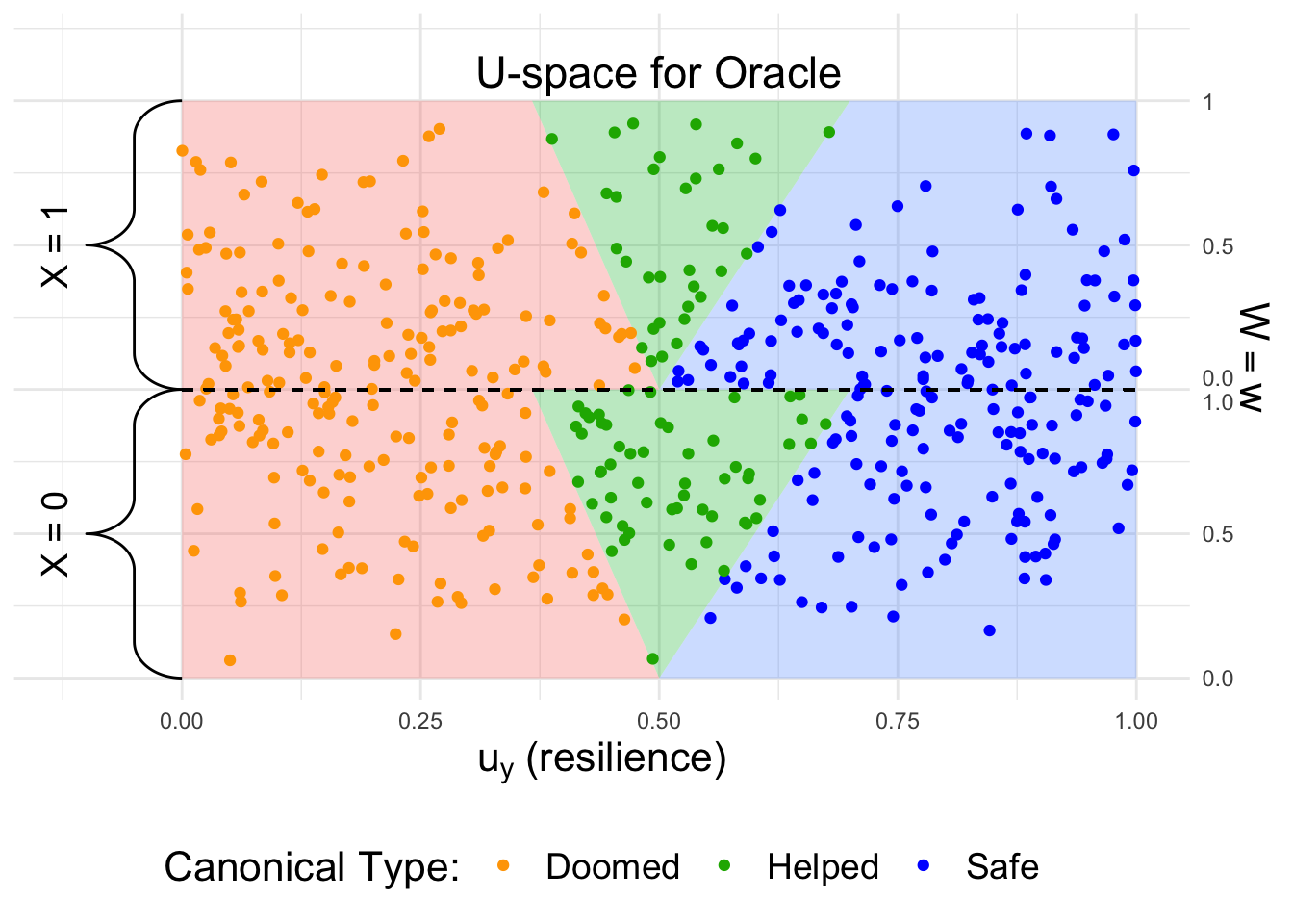 The latent variable \(U_Y\) determines which canonical type the individual belongs to. After generating the data, we visualize it from the oracle’s perspective, assuming access to \(U_Y\):