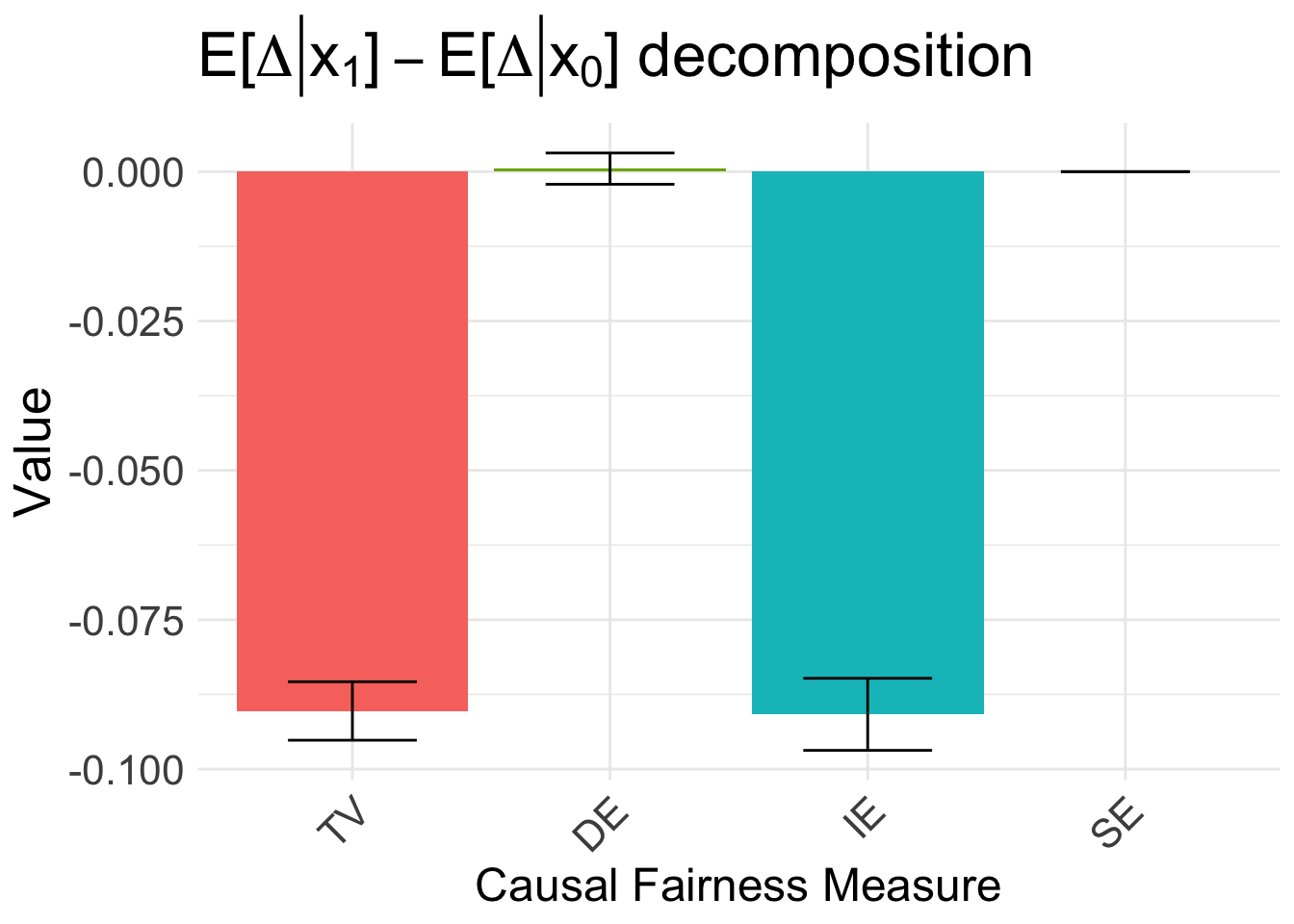 Therefore, as explained in the paper, the disparity is driven by the indirect effect. We can also decompose the disparity in the estimated benefit \(E[\Delta \mid x_1] - E[\Delta \mid x_0]\):